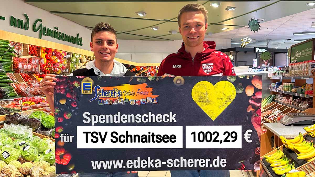 Noch kein Jahr alt ist die Aktion „EDEKA Vereinskarten für den TSV Schnaitsee“, und schon durften wir bei Georg Scherer jun. die erste Auszahlung entgegennehmen. Sage und schreibe über 1.000 Euro sind in den ersten acht Monaten zusammengekommen, die TSV-Vorstand Eric Löffelmann im Januar in Empfang nehmen durfte.