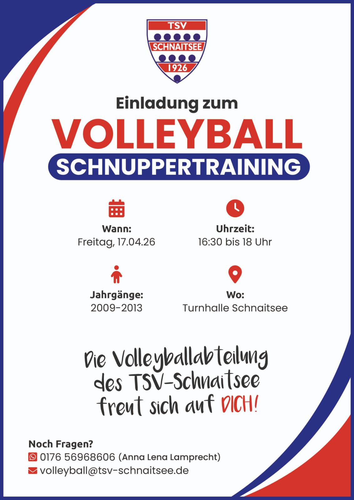 Hallo liebe TSVler, am 17.04. findet bei uns in der Halle ein Volleyball-Schnuppertraining statt!🏐🏐