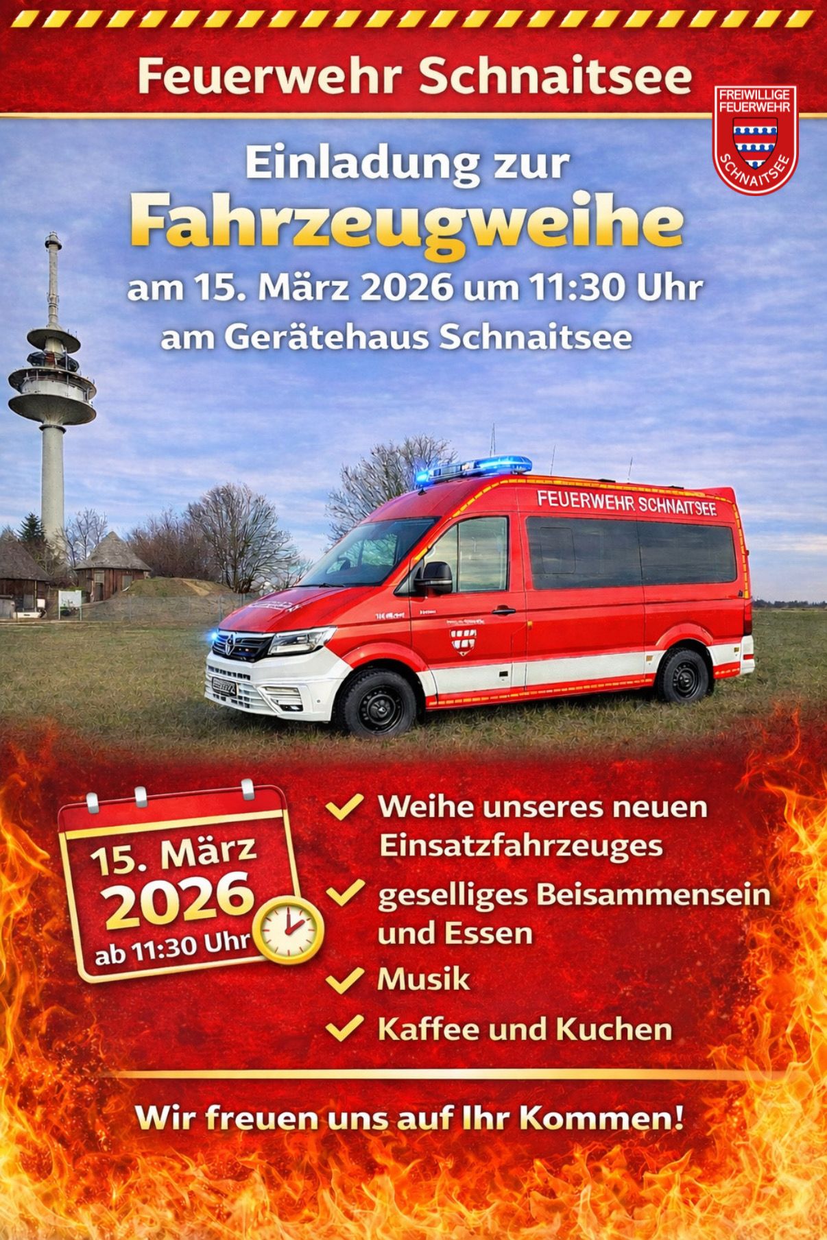 Die Feuerwehr Schnaitsee hat uns herzlich zur Fahrzeugweihe ihres neuen Einsatzfahrzeuges eingeladen. Die Feier findet am Sonntag, 15. März 2026, ab 11:30 Uhr am Gerätehaus in Schnaitsee statt. Neben der offiziellen Weihe des neuen Fahrzeugs erwartet uns ein geselliges Beisammensein mit Essen, Musik sowie Kaffee und Kuchen.