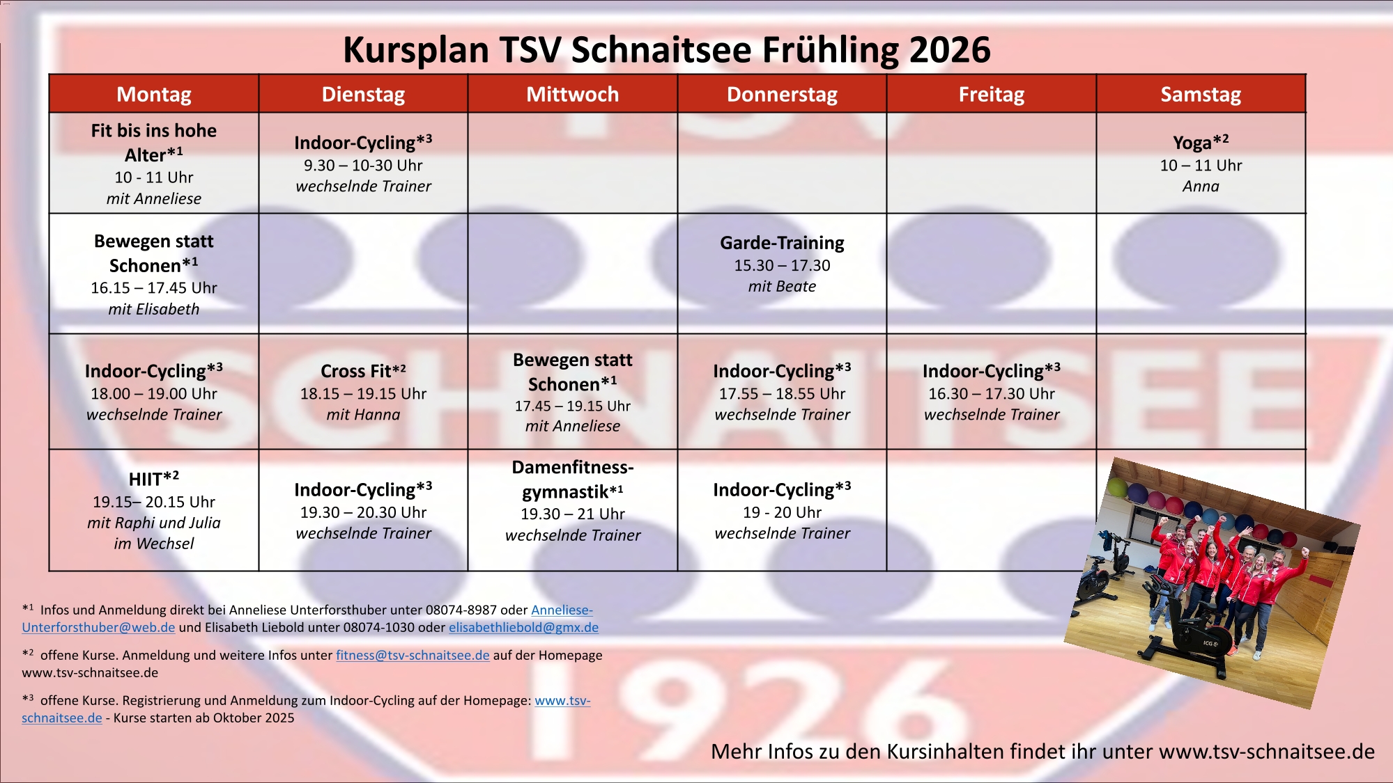 Die Abteilung Fitness bietet euch verschiedene Kurse zu den Themen Workout, Gesundheit und Entspannung an. Für zusätzliche Informationen, Fragen und Anmeldungen zu den Kursen schreibt uns eine Email an fitness@tsv-schnaitsee.de