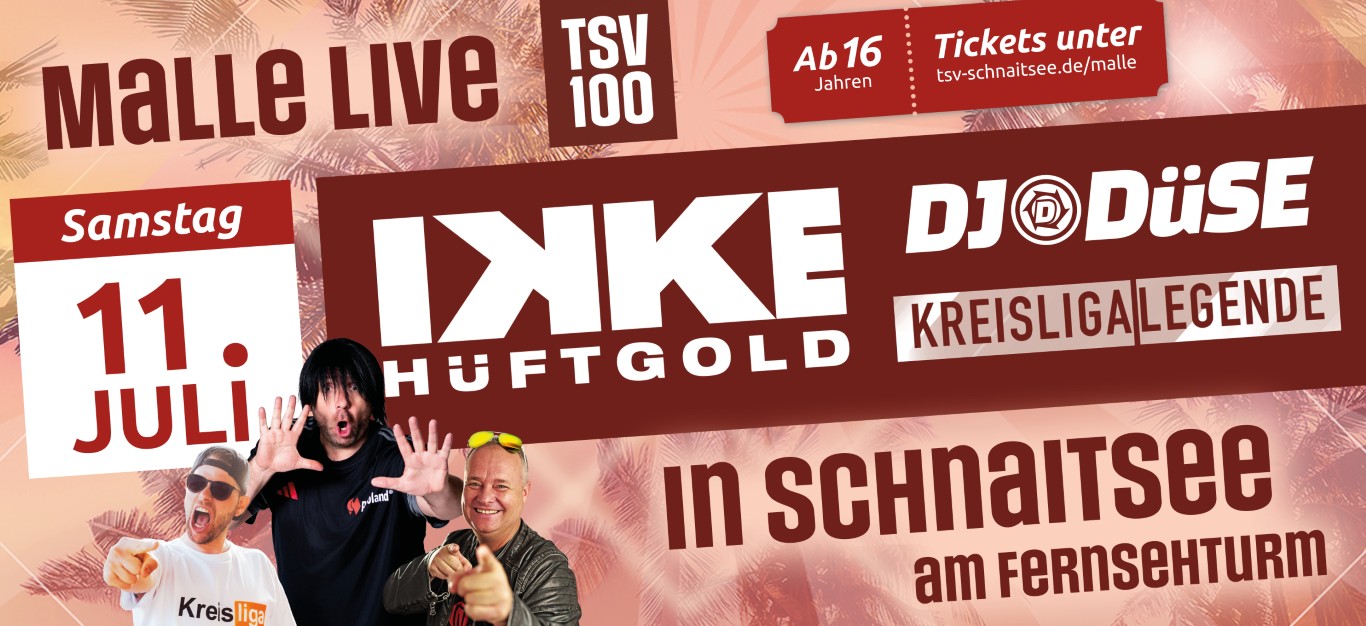 Wir starten unser Jubiläum mit einem echten Knaller und bringen die Mallorca-Party direkt nach Schnaitsee! Am Samstag, den 11. Juli 2026 heißt es: Mallorca-Stimmung am Fernsehturm – mit den Stars aus der Partyszene: Ikke Hüftgold, Kreisligalegende und DJ Düse. Gemeinsam verwandeln sie das Festzelt in die größte Malle-Party der Region.