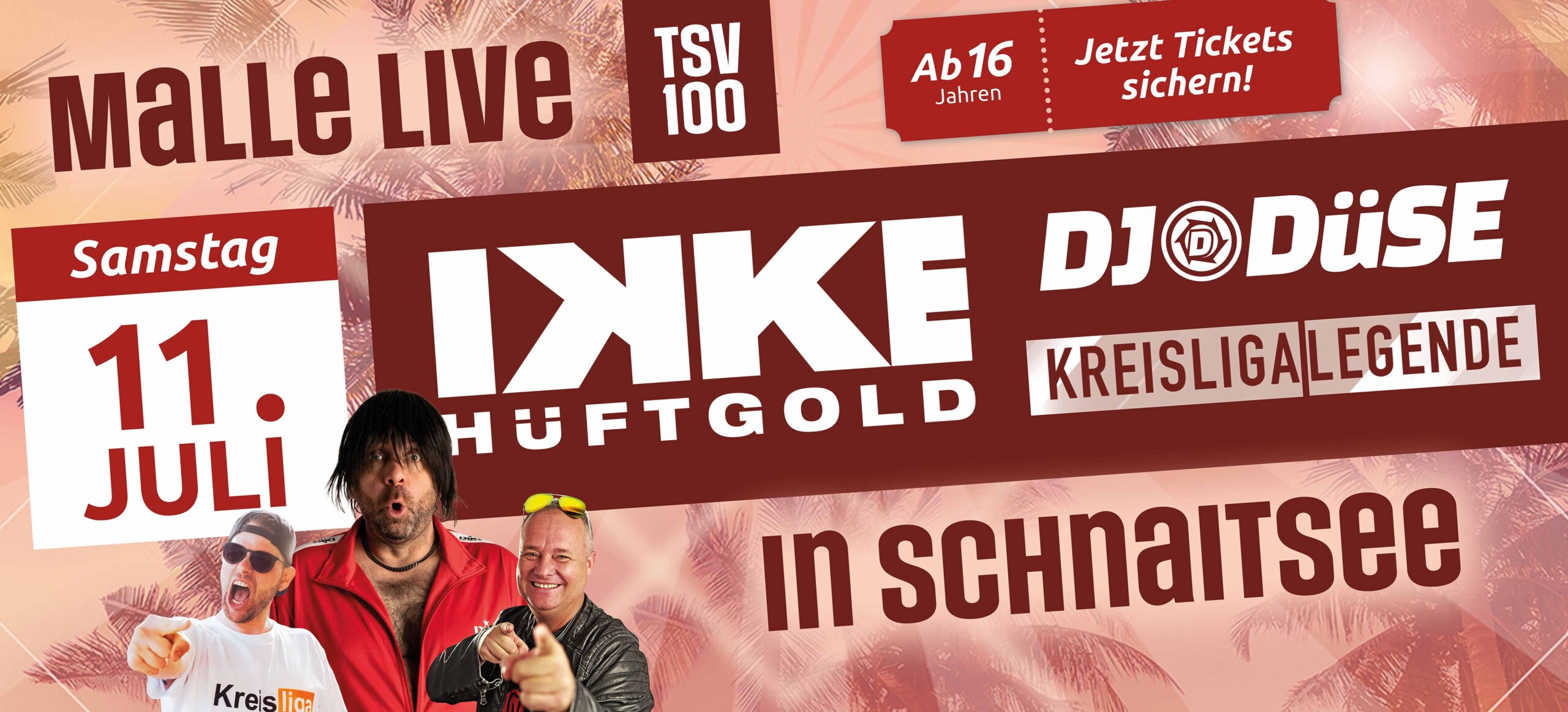 Wir starten unser Jubiläum mit einem echten Knaller und bringen die Mallorca-Party direkt nach Schnaitsee! Am Samstag, den 11. Juli 2026 heißt es: Mallorca-Stimmung am Fernsehturm – mit den Stars vom Ballermann: Ikke Hüftgold, Kreisligalegende und DJ Düse. Gemeinsam verwandeln sie das Festzelt in die größte Malle-Party der Region.