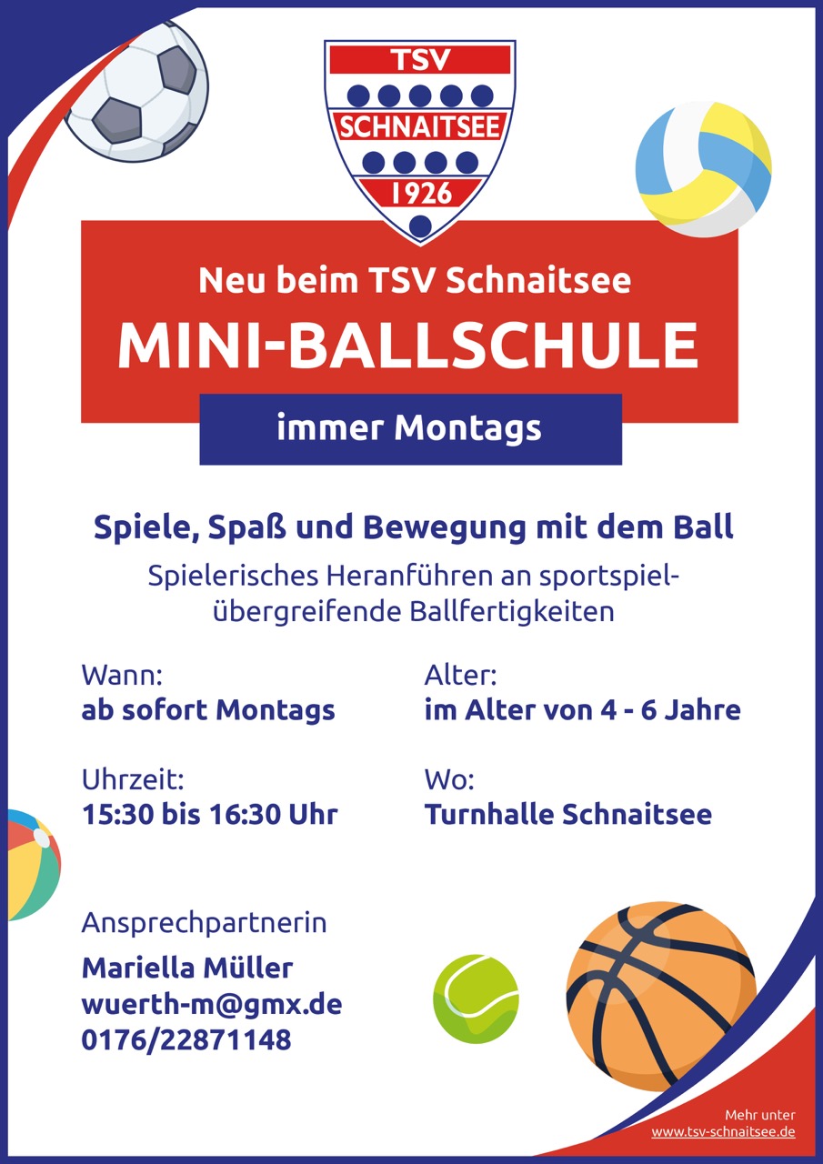 Spiel, Spaß und Bewegung stehen bei unserer Mini-Ballschule im Mittelpunkt. Kinder im Alter von 4 bis 6 Jahren werden spielerisch an vielseitige Ballfertigkeiten herangeführt – sportartübergreifend und mit viel Freude an Bewegung. Die Mini-Ballschule findet jeden Montag von 15:30 bis 16:30 Uhr in der Turnhalle Schnaitsee statt. Neue Kinder sind jederzeit herzlich willkommen!