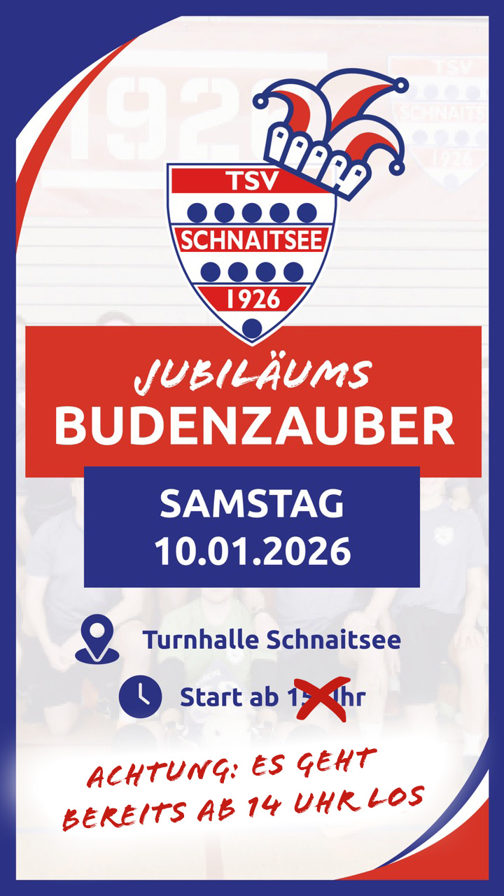 Das Festjahr des TSV Schnaitsee beginnt gleich mit einem echten Hochkaräter! Die Fußballabteilung des TSV Schnaitsee veranstaltet nämlich wieder ihr spaßiges internes Hallenturnier! Der berühmt-berüchtigte Budenzauber findet dieses Jahr am Samstag, den 10.01.2026 statt. Los geht’s in der Turnhalle bereist um 14 Uhr! Für Unterhaltung inkl. Moderation sowie einem Auftritt unserer TSV-Garde, den „Starlights“, ist natürlich gesorgt. Nach der Siegerehrung geht’s dann mit allen Mannschaften noch ins Musikcafe Sammy’s zur klassischen Aftershow-Party.