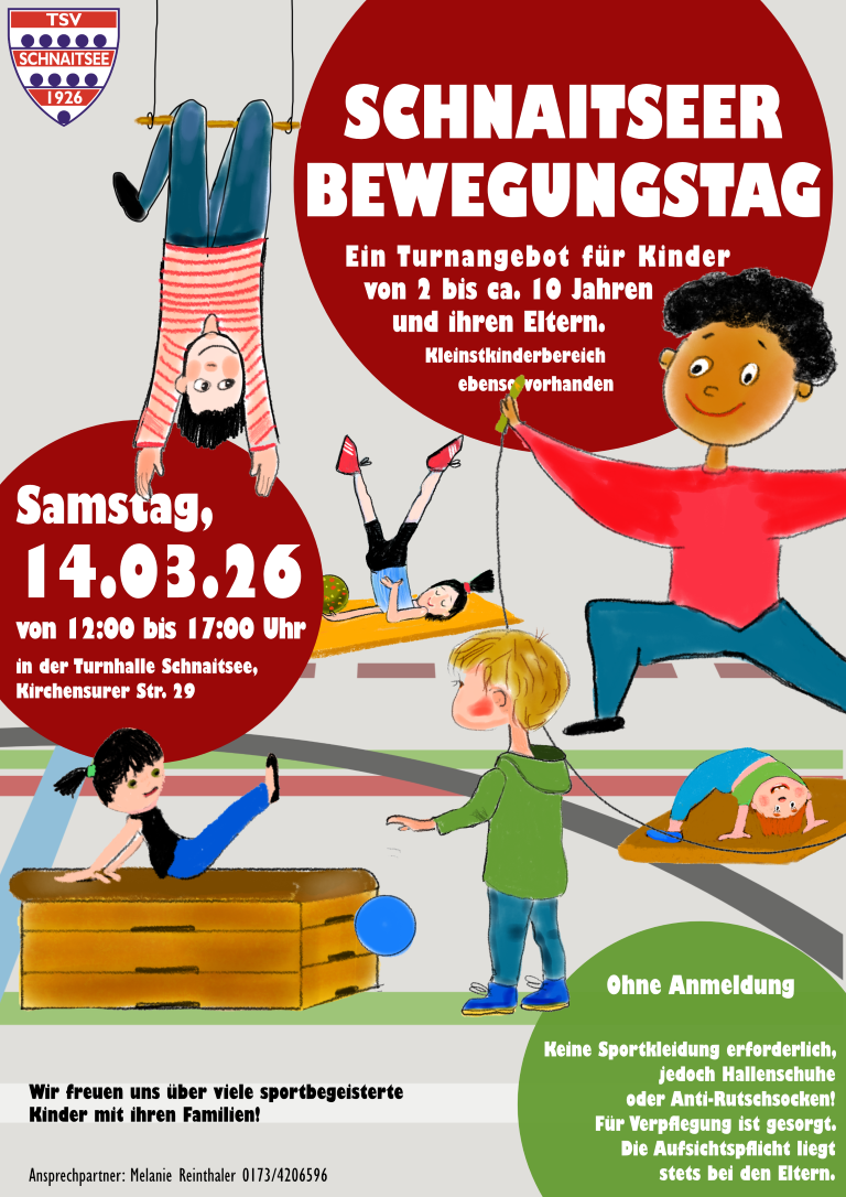 Der TSV Schnaitsee lädt am Samstag, den 14. März, herzlich zum Schnaitseer Bewegungstag in die Turnhalle Schnaitsee ein. Von 12:00 bis 17:00 Uhr dreht sich alles um Spaß an Bewegung, gemeinsames Ausprobieren und spielerisches Fitsein für Groß und Klein. Kinder im Alter von 2 bis etwa 10 Jahren können gemeinsam mit ihren Eltern und Großeltern verschiedene Turngeräte entdecken, balancieren, klettern, springen und ihre motorischen Fähigkeiten testen. Auch für unsere ganz Kleinen gibt es einen eigenen Kleinstkinderbereich, sodass wirklich jede Familie auf ihre Kosten kommt.