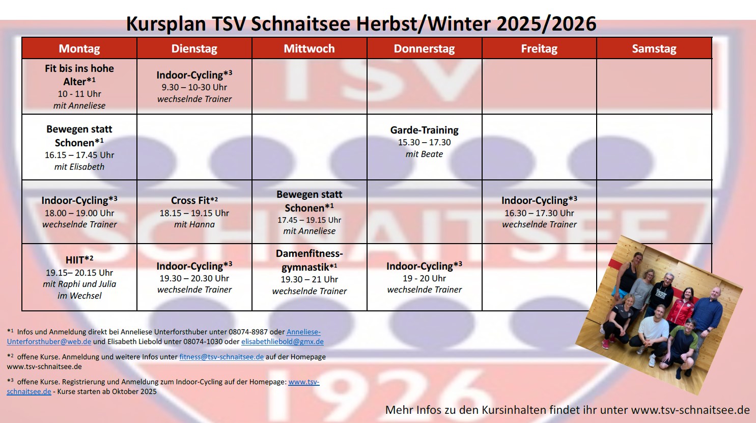 Weitere Infos sowie 10er-Karten erhaltet ihr direkt bei euren Kursleitern. Für weitere Rückfragen steht euch unsere Abteilungsleitung zur Verfügung: fitness@tsv-schnaitsee.de