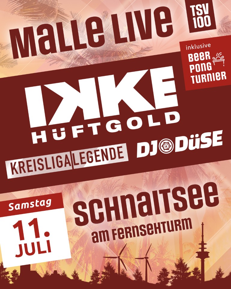 Zum Auftakt unserer großen Jubiläumsfestwoche zum 100-Jährigen sorgt ein echtes Ballermann-Trio für Ausnahmezustand: Ikke Hüftgold, Kreisligalegende und DJ Düse heizen euch live vor Ort mit den besten Malle-Hits so richtig ein! Freut euch auf viele Malle-Extras, ein legendäres Beer-Pong-Turnier und natürlich auf beste Stimmung. Es wird der perfekte Start in unsere Festwoche!