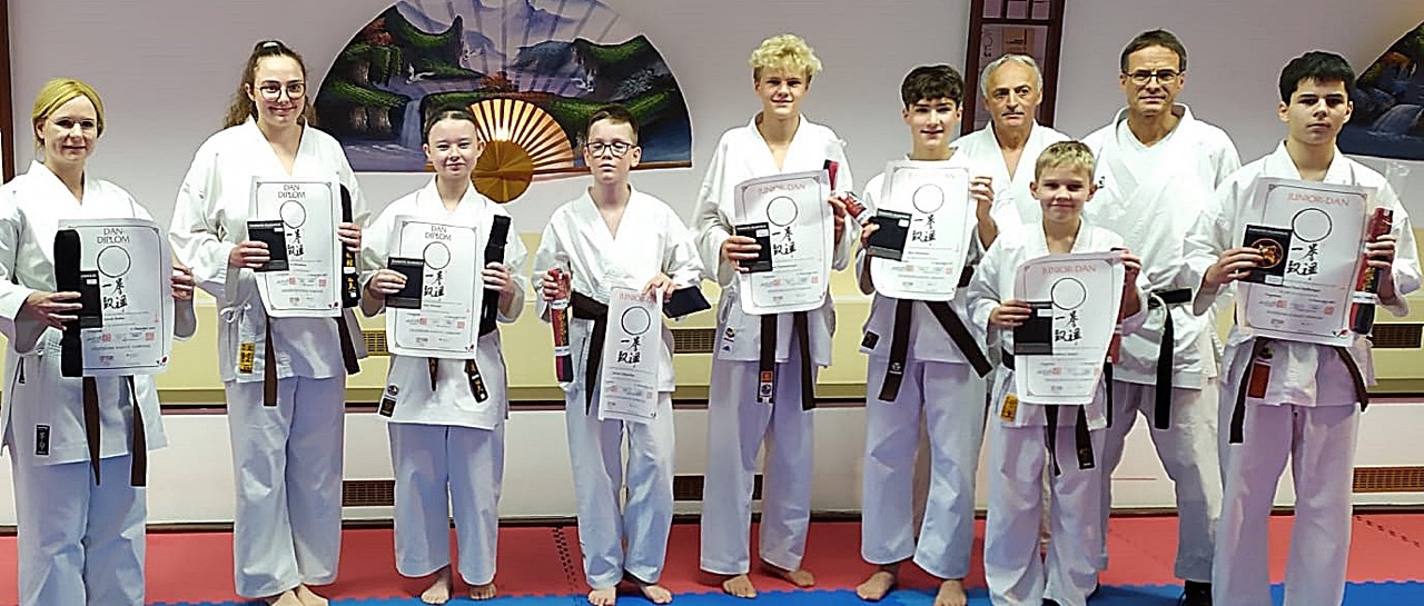 Zusammen mit weiteren jungen Karate-Sportlern haben Sarah Rodler (von links) und Anna Wennehorst die Prüfung zum Schwarzgurt bestanden. Garant für die Erfolge ist auch ihr Lehrer Richard Schalch (vierter von rechts).