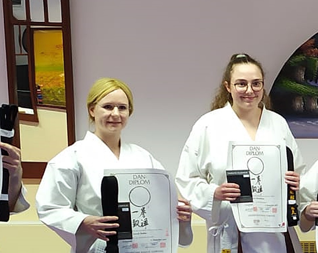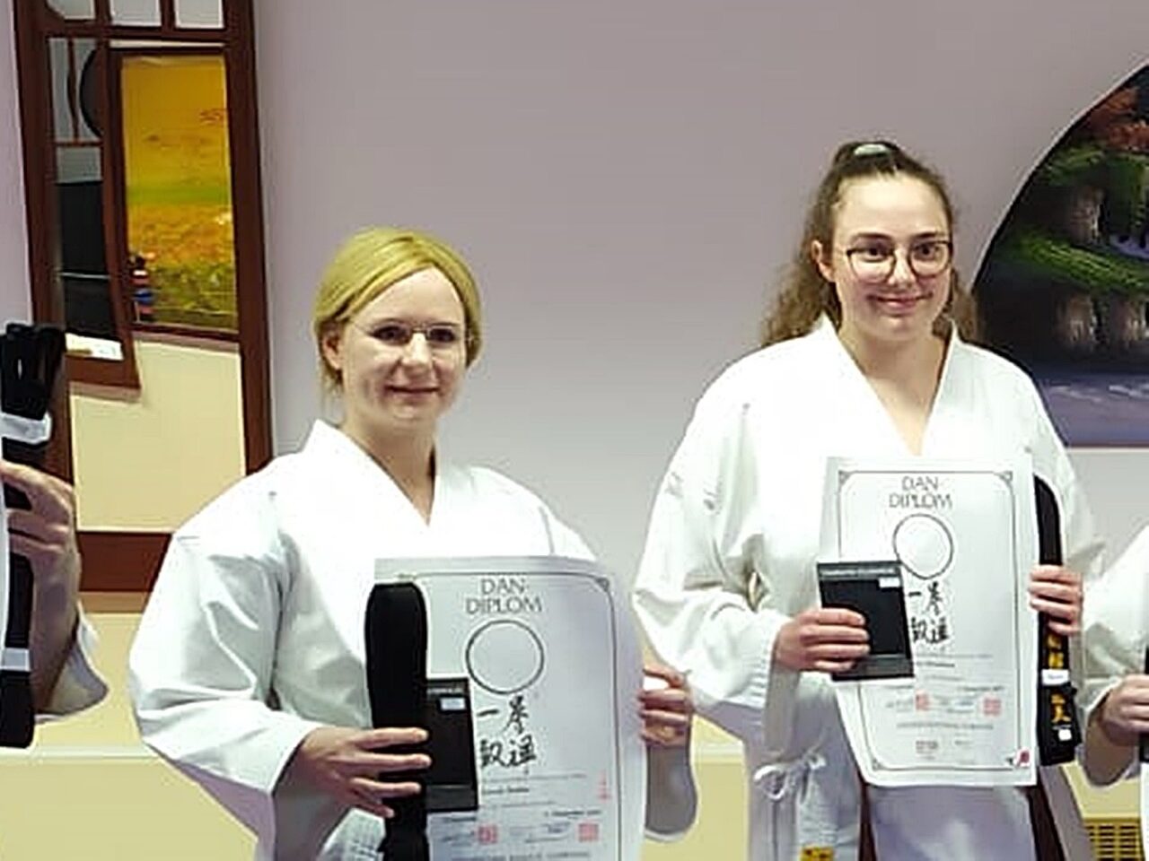 Schnaitsee (uk) Große Freude in der Karateabteilung des TSV Schnaitsee. Im Dezember haben die zwei jungen Sportlerinnen Sarah Rodler und Anna Wennehorst die Prüfung zum schwarzen Gürtel bestanden. Ein Jahr lang haben sie sich mit Ausdauer, Fleiß und Disziplin auf die Prüfung vorbereitet und ihr Können den beiden Prüfern Richard Schalch (7. Dan) und Uli Hölzl (5. Dan) bewiesen. Der gesamte TSV Schnaitsee gratuliert den beiden zu diesem tollen Erfolg. Besonders die Abteilung Karate ist stolz auf das Duo: „Damit sind wir nicht nur um zwei Schwarzgurt-Träger reicher, sondern auch um zwei Aushängeschilder, die beweisen, dass beim TSV Schnaitsee sehr erfolgreich Karate gelehrt wird“, so Lydia Moelter von der Abteilung.